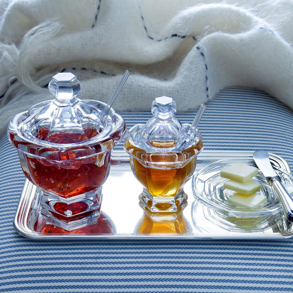 The stunning Missouri mustard jar showcases Baccarat Crystal, rigor of form and beautiful craftsmanship with tableware pieces. The mustard jar comes with an accompanying Baccarat Crystal, clear crystal spoon. This jar is a beautiful item from which to serve any condiment or complementary sauce during a meal, as the clear crystal contrasts magnificently with the vividness of the mustard or other contained condiment. The Missouri mustard jar is just as readily a standalone decorative piece. The bell-shaped lid is topped with a round knob, and the curved contours of the Crystal Bowl stand out against the angularity of the crystal spoon, which extends outward at a 45-degree angle from the symmetrical form. A Baccarat Crystal, clear crystal jam jar is also available. H: 4.5″ FR 243 Crystal BACCARAT INC Baccarat Crystal 736415028468 1837180B Spoon with Jar Mustard Missouri Crystal Baccarat