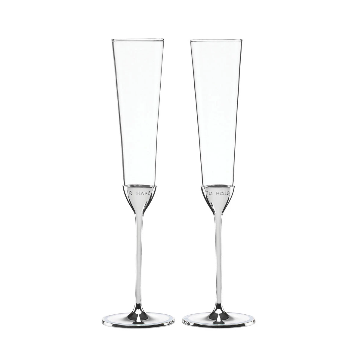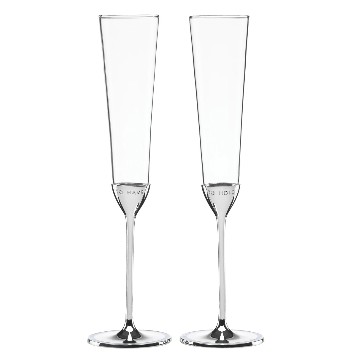 Crafted with silver-plated stems, these flutes will celebrate the newlyweds in a very lovely way–one flute is inscribed with the phrase “To Have”, the other with “To Hold”. H: 10″, 6oz. 15 Metal CN Lenox Corp Lenox 882864566485 854777L Pair Flute Toasting Cake The Take Lenox York New Spade Kate