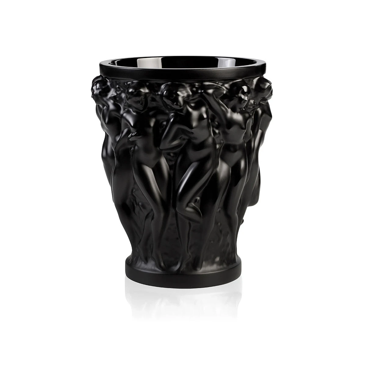 Lalique glass is lead based, either mold blown or pressed. Favored motifs during the Art Nouveau period were dancing nymphs, fish, dragonflies, and foliage. Characteristically the glass is crystal in combination with acid-etched relief. In addition to vases, clocks, automobile mascots, stemware, and bottles, many other useful objects were produced. While not well known, Lalique also experimented with bronze and other materials as well.