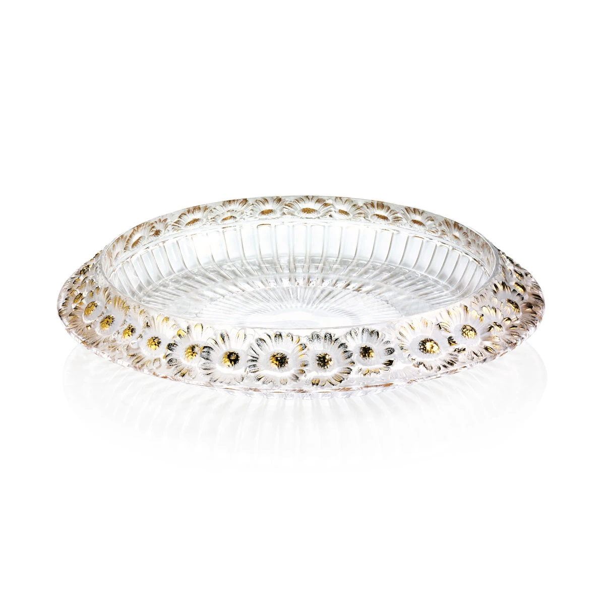 Lalique glass is lead based, either mold blown or pressed. Favored motifs during the Art Nouveau period were dancing nymphs, fish, dragonflies, and foliage. Characteristically the glass is crystal in combination with acid-etched relief. In addition to vases, clocks, automobile mascots, stemware, and bottles, many other useful objects were produced. While not well known, Lalique also experimented with bronze and other materials as well.