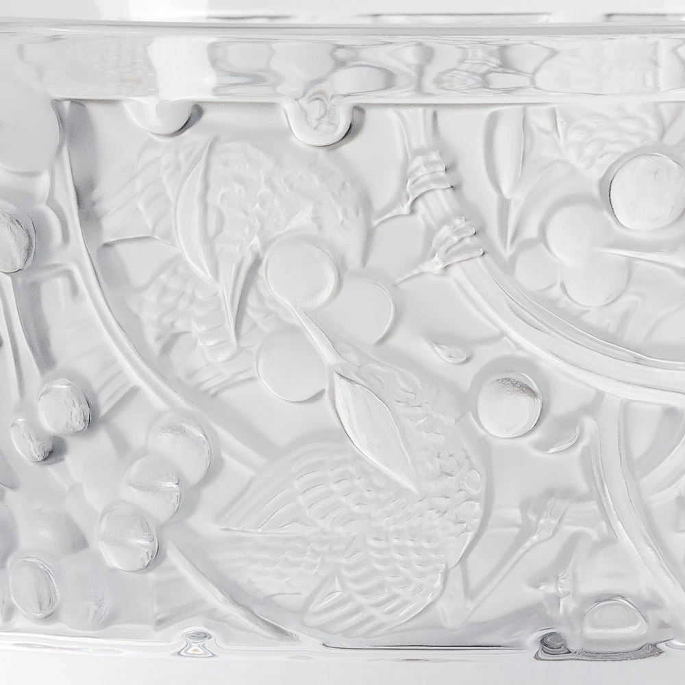 In 1928, Rene Lalique designed the Merles and Raisins decorative panels, originally in created in pressed glass on a silver background and adorned the Cuban mahogany woodwork of the legendary Orient Express. Today, the Lalique Studio reinterprets this emblematic creation, in new expressions through vases and a bowl. The precious cultural heritage of the House thus comes to life in very contemporary shapes. H 4.53″ x D 9.33″ FR Crystal Lalique Lalique 0090592883228 10732900 Clear Bowl 9.5″ Raisins et Merles Lalique