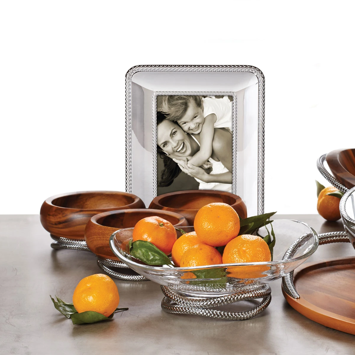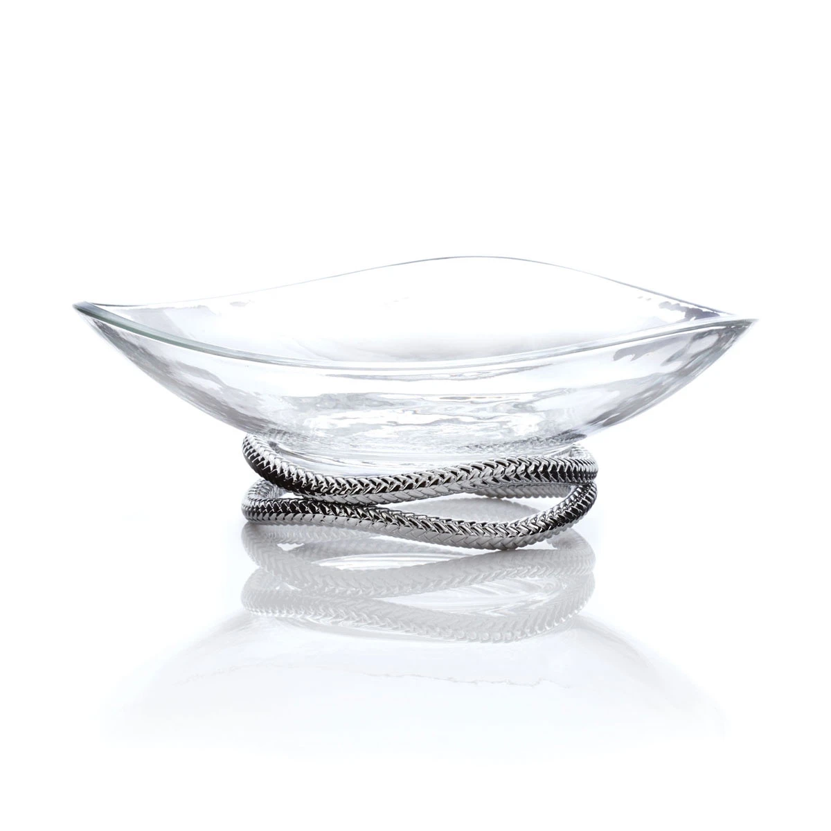 This sleek glass bowl with gently curved corners rests on an artful coil of chrome plate. A combination of the brightly textured metal base and the serene expanse of glass give the Braid Centerpiece Bowl a unique freshness and aesthetic sensibility. 11″ L x 11″ W x 3.75″ H IN 219 Metal NAMBE LLC Nambe Mills, Inc. 672275306363 MT0636N Bowl Centerpiece Braid 11″ Nambe