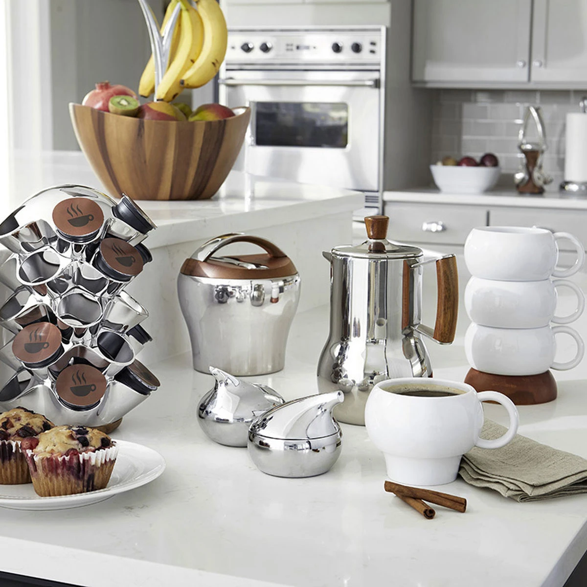 The Fruit Tree Bowl adds a delicious sense of fun and jubilation to the kitchen or dining room. Fill the bowl with seasonal produce, and drape bananas or grapes over the Nambe alloy fingers for a celebration of wholesome goodness. The rich, natural wood tones make the fruit colors pop, and the upward gesture of the fingers and of the shape of the bowl itself give this unique piece an irresistibly playful spirit.