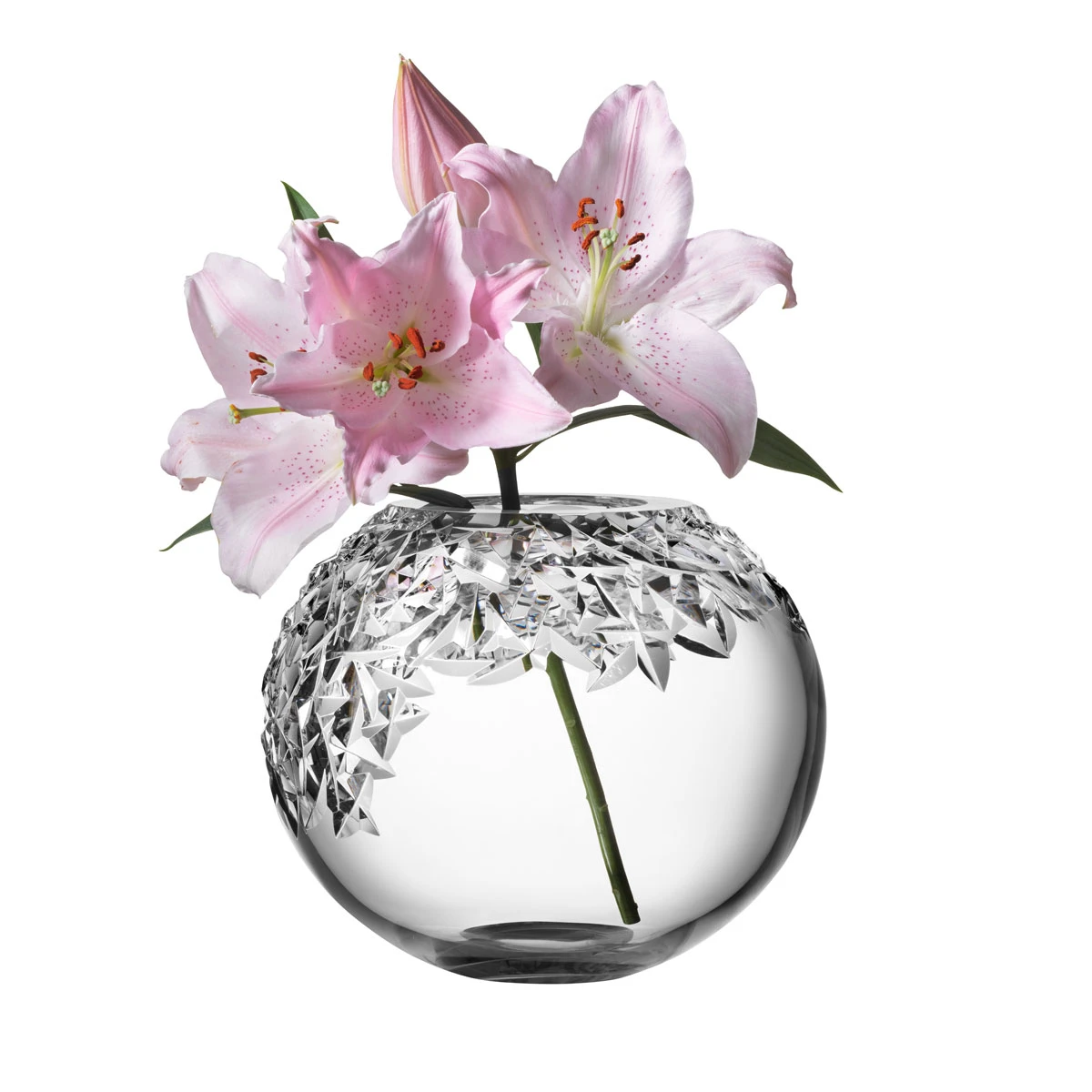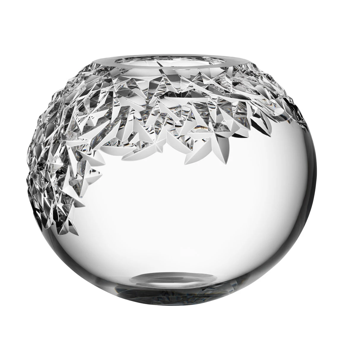 The Carat collection is based on a contemporary interpretation of the traditional cut glass for which Orrefors is world-renowned. Carat Globe Vase XL has an asymmetrical motif at the top, which produces beautiful reflections of light in the crystal and provides contrast against the smooth glass. The vase is perfect for top-heavy flowers and large bouquets since the globe shape allows the stems to spread out. Designed by Lena Bergstrom. H: 9.84″ W: 12.01″ TR 211 Crystal RSI Orrefors Kosta Boda 7321646062874 6590133 Vase 9.75″ Globe Cut Upper Carat Orrefors