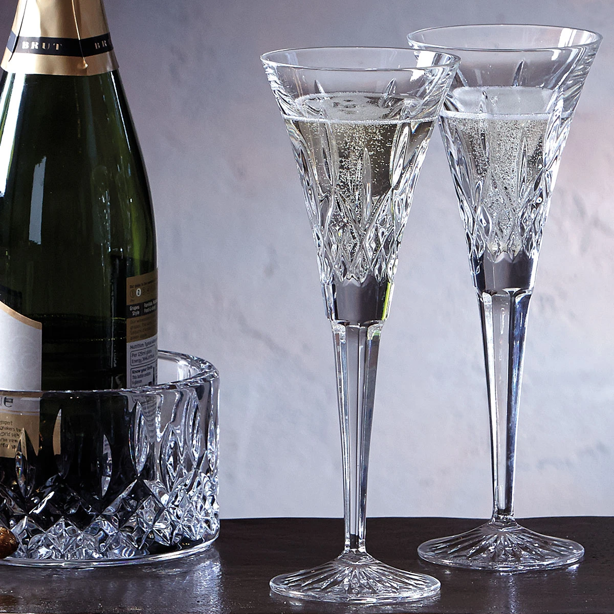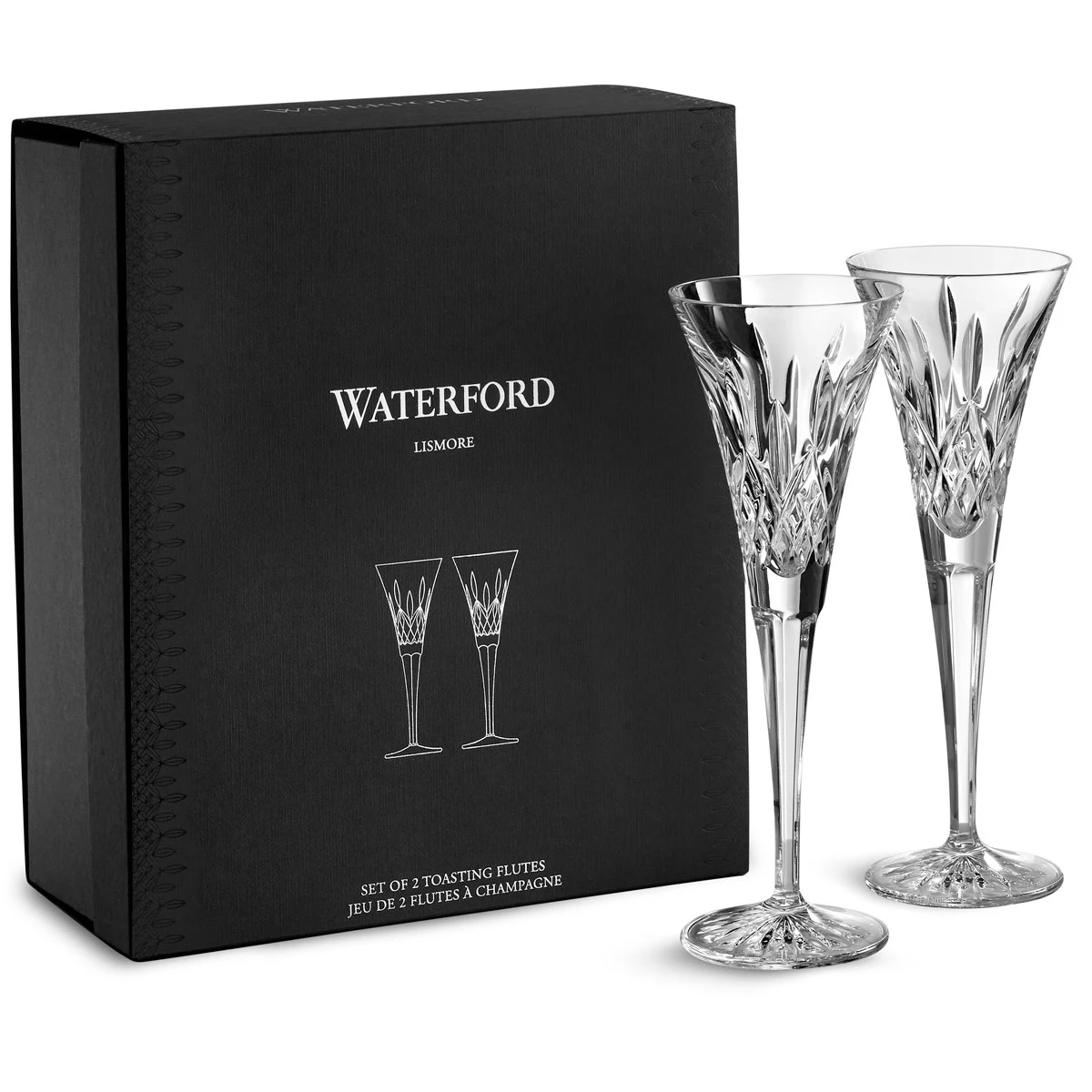 Transform any toast into a grand occasion with the Lismore Toasting Flute Pair and bring flair to Champagne, spumante or any celebratory cocktail. Dazzling on the eye, the elegant flared neck and beautifully adorned Lismore pattern on these crystal flutes produce a striking visual at parties, celebrations and even the most casual of occasions, shining with the clarity and unrivaled brilliance thats synonymous with the finest crystal. Stylishly presented in an elevated gray gift box embossed on the border with the beloved Lismore pattern in black foil: a perfect gift for any occasion.